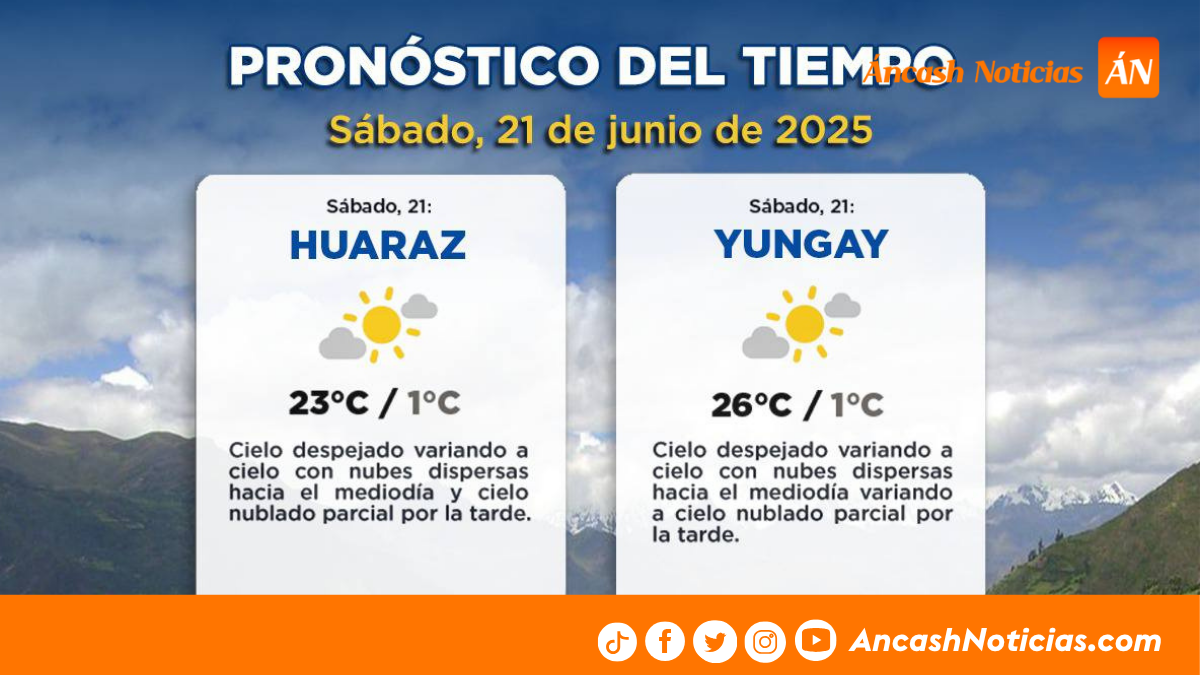 - Frío extremo en la sierra: Recuay amaneció con 0 °C; Huaraz y Yungay registraron 1 °C; y Chiquián alcanzó los 3 °C. En contraste, Pomabamba, Sihuas y Chavín tuvieron temperaturas más templadas, entre 7 y 9 °C.