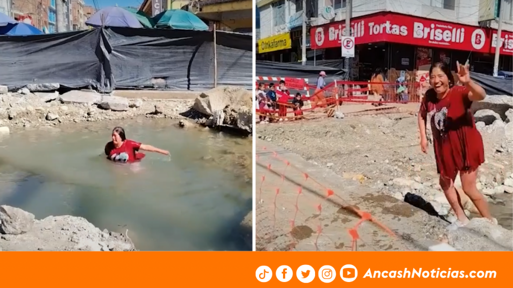 Una usuaria identificada como Olinda se volvió tendencia en redes sociales tras difundirse un video en el que aparece sumergiéndose en un charco de agua estancada en plena vía pública de Huaraz. La escena fue registrada en un tramo en ejecución de la avenida Raymondi, donde se desarrollan actualmente trabajos de infraestructura vial.