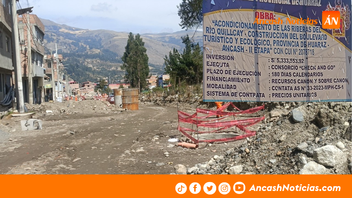 El malecón sur del río Quillcay, en Huaraz, permanece con los trabajos suspendidos mientras la municipalidad espera el pronunciamiento de la Contraloría General de la República sobre un adicional presupuestal que permita continuar la obra de pavimentación.