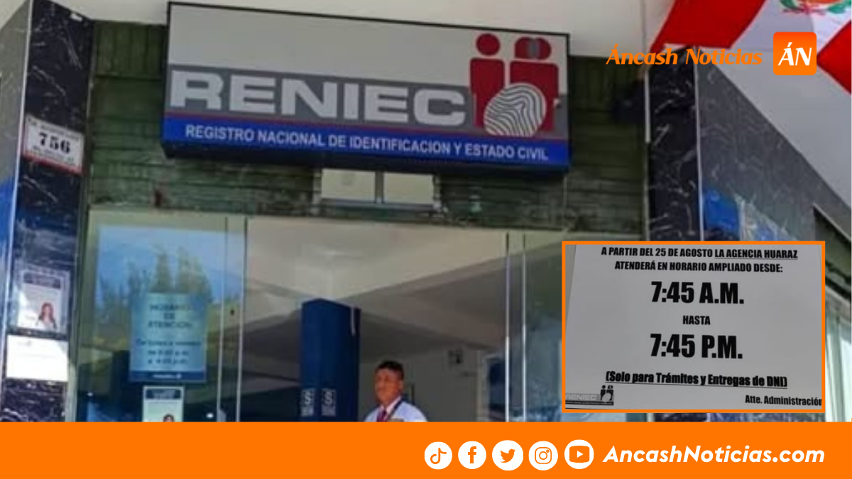 La oficina del Registro Nacional de Identificación y Estado Civil (RENIEC) en Huaraz informó ayer, 25 de agosto, la ampliación de su horario de atención al público. Desde esta disposición, la entidad atenderá de 7:45 a. m. hasta las 7:45 p. m., únicamente para trámites y entrega del Documento Nacional de Identidad (DNI).