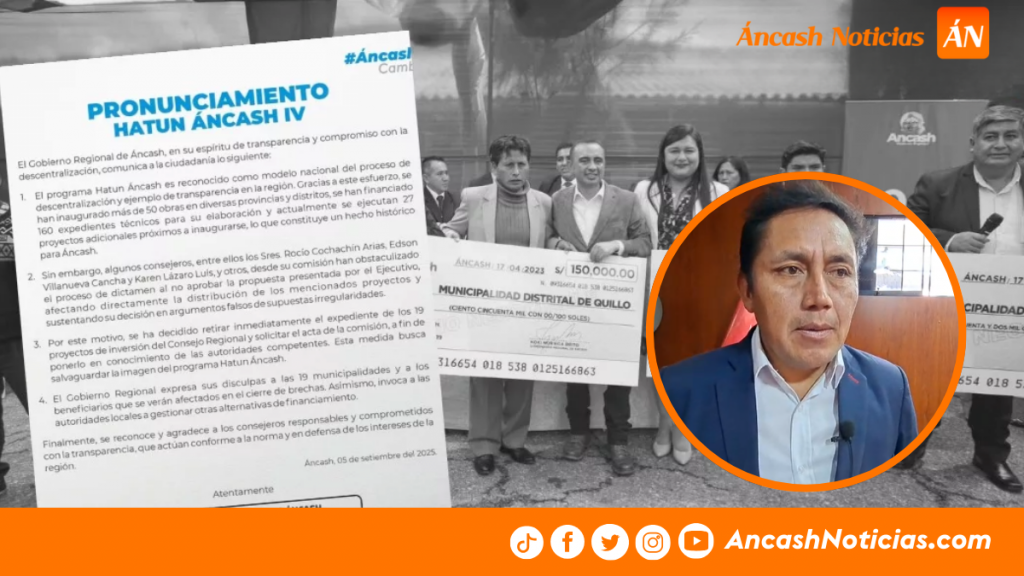El consejero delegado del Consejo Regional de Áncash, Yover Montoya, cuestionó el comunicado emitido por el Ejecutivo regional en el que se anunció el retiro de 19 proyectos del programa Hatun Áncash IV.