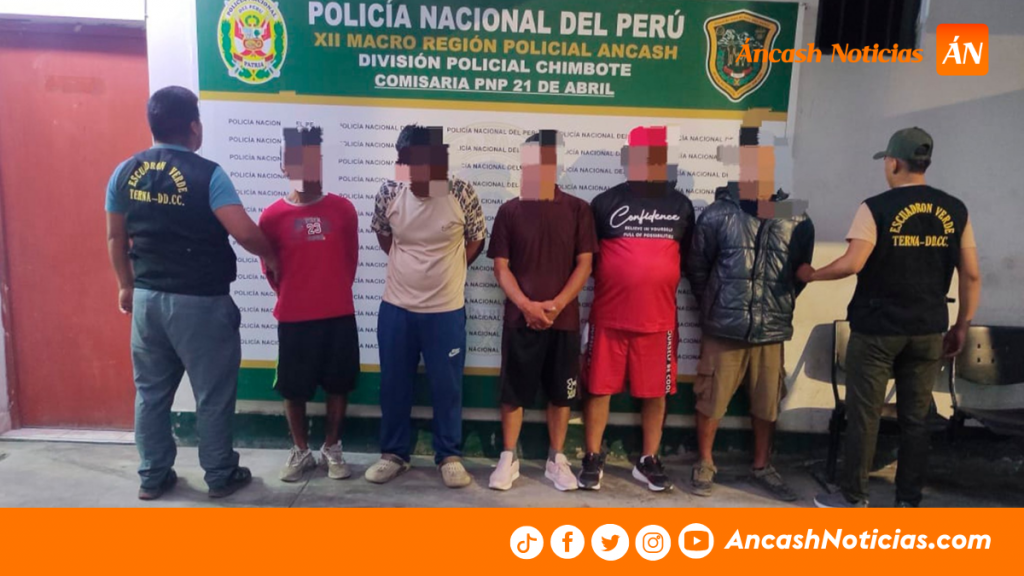 Efectivos del grupo Terna Chimbote lograron la intervención de cinco integrantes de la presunta organización delictiva denominada “Los Chacales de Cachito”, dedicada a la venta y distribución de sustancias prohibidas en el distrito de Chimbote.