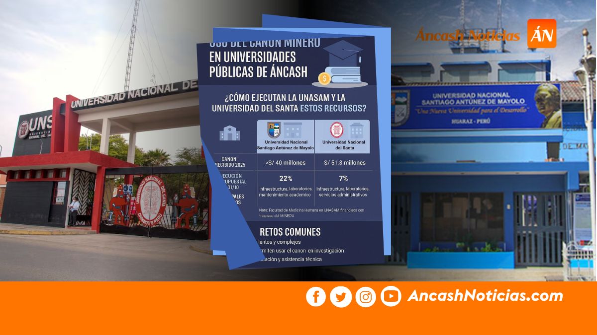 Las universidades públicas de Áncash reciben cada año recursos significativos provenientes del canon minero, destinados a mejorar la calidad educativa, la investigación y el desarrollo regional. De todo el presupuesto que se les asigna, una parte corresponde a regalías y canon minero y gasífero. Por ley, una universidad pública recibe el 20 % del total del canon: dos de cada diez soles llegan directamente a sus cuentas. Sin embargo, al cierre de octubre de 2025, tanto la Universidad Nacional Santiago Antúnez de Mayolo (UNASAM) como la Universidad Nacional del Santa (UNS) muestran bajos niveles de ejecución presupuestal, lo que limita el impacto real de estos fondos.