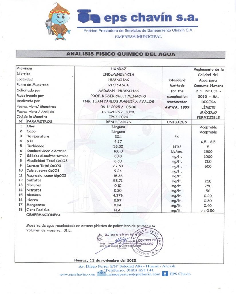 Un informe de la EPS Chavín y análisis del Centro de Salud confirmaron la presencia de metales en el agua de consumo humano. La Diresa Áncash anunció acciones de control, monitoreo y evaluación sanitaria.