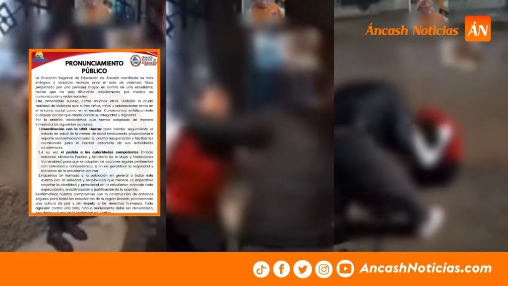 Tras la difusión del material audiovisual, la DRE Áncash emitió un pronunciamiento oficial en el que condena el acto de violencia y recuerda que este tipo de situaciones evidencian los riesgos que enfrentan niñas, niños y adolescentes tanto dentro como fuera del entorno escolar.