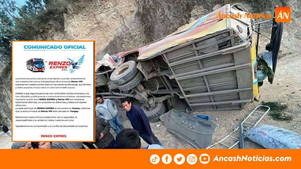 La empresa explicó que Renzo Expres y Renzo VIP son compañías diferentes, cada una con propietarios, administración y rutas propias. Renzo Expres tiene su sede en Huaraz, mientras que Renzo VIP opera desde Yungay. La compañía señaló que esta diferencia no fue considerada en varios mensajes que se difundieron tras el accidente.