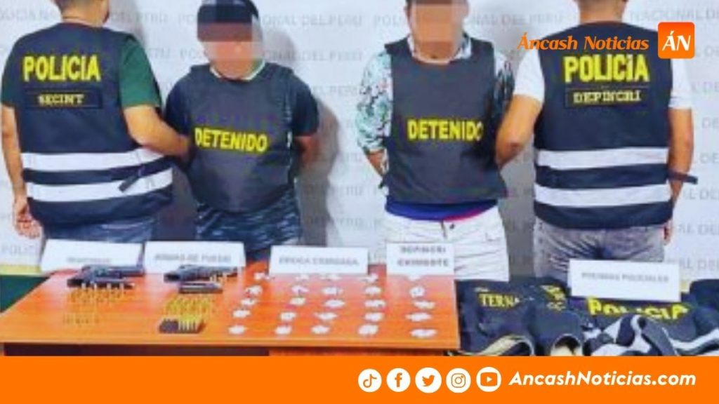 La Policía Nacional detuvo a dos hombres presuntamente vinculados a la banda criminal “Los Patecos – Nueva Generación” en posesión de armas de fuego, municiones, droga e indumentaria policial. Las intervenciones se realizaron ayer en los pueblos jóvenes La Victoria y San Isidro, en Chimbote, informó el Departamento de Investigación Criminal (Depincri).