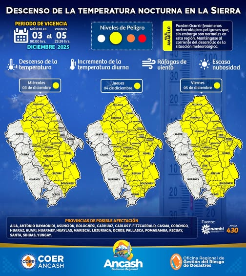 El Centro de Operaciones de Emergencia Regional (COER Áncash) informó que desde este miércoles 3 hasta el viernes 5 de diciembre se presentará un descenso marcado de la temperatura nocturna en la sierra de Áncash. Durante estos días también se reportarán ráfagas de viento de hasta 45 km/h, escasa nubosidad y mayor brillo solar durante el día.