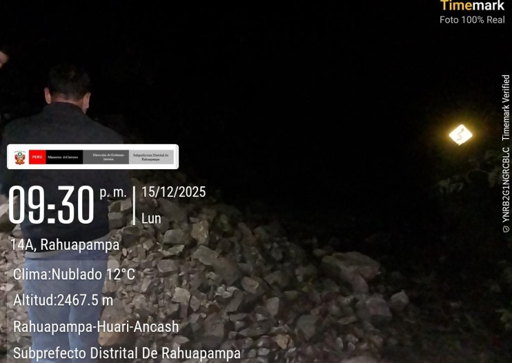 A consecuencia de las intensas lluvias registradas en la zona, la tarde del 15 de diciembre, alrededor de las 18:00 horas, se produjo un derrumbe de cerro que ocasionó daños en la vía nacional 14A, afectando aproximadamente 20 metros de la carretera en el centro poblado de Ashancay, distrito de Rahuapampa, provincia de Huari, informó el COER Áncash.