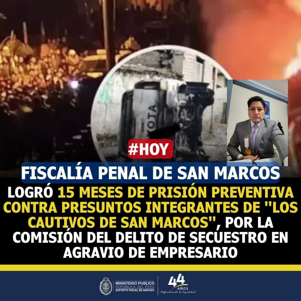 El Juzgado de Investigación Preparatoria de San Marcos – Huari ordenó 15 meses de prisión preventiva para los presuntos integrantes de la banda “Los Cautivos de San Marcos”, mientras avanzan las investigaciones por el intento de secuestro de un empresario local.
