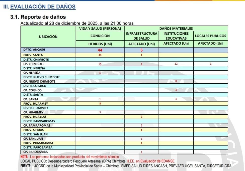 De acuerdo con la evaluación preliminar de daños actualizada al 28 de diciembre de 2025, el COER reportó un total de 44 personas heridas en todo el departamento de Áncash, producto directo del movimiento sísmico. Del total, 41 lesionados corresponden a la provincia del Santa y 3 a la provincia de Huarmey.