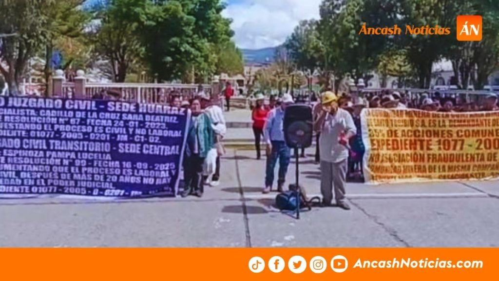 Un grupo de ex trabajadores de la Compañía Minera Santo Toribio volvió a movilizarse en Huaraz para exigir celeridad en el pronunciamiento de los jueces de la Corte Superior de Justicia de Áncash respecto al pago de acciones que, según indicaron, permanece sin resolverse desde hace más de dos décadas.