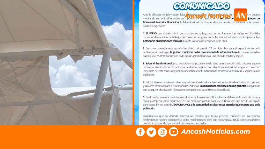 Tras la difusión de publicaciones que aseguraban que parte del techo del área de juegos del boulevard Pastorita Huaracina se había desplomado a pocos días de su inauguración, la Municipalidad Distrital de Independencia descartó un colapso de la estructura y señaló que las imágenes corresponden a trabajos de corrección técnica en ejecución.
