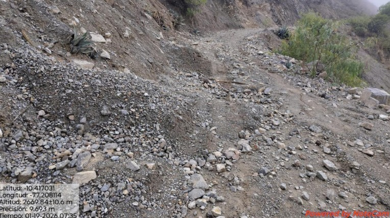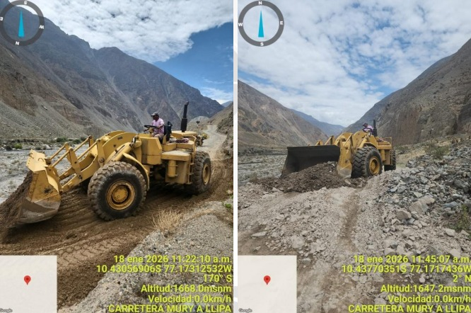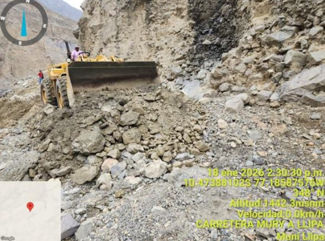 En el distrito de Llipa, provincia de Ocros, el pasado 18 de enero, a las 08:30 horas, un derrumbe de cerro afectó aproximadamente 300 metros de la vía vecinal AN-1307, en el tramo comprendido entre los puentes Rapay y Muri. Ante esta situación, el 19 de enero, desde las 11:00 horas, personal de la Oficina de Gestión del Riesgo de Desastres de la Municipalidad Distrital de Llipa, con apoyo de maquinaria pesada, ejecutó labores de limpieza y liberación de la vía, logrando restablecer el tránsito vehicular alrededor de las 16:00 horas.