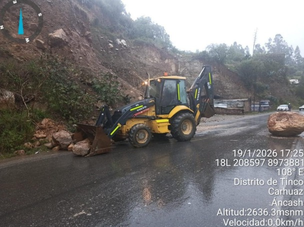 En tanto, en el distrito de Tinco, provincia de Carhuaz, las lluvias intensas provocaron el derrumbe de rocas en la vía nacional PE-3N, a la altura del sector Paty Bajo, afectando aproximadamente cinco metros de la calzada. La emergencia fue atendida por la Municipalidad Provincial de Carhuaz, que desplegó maquinaria pesada desde las 17:20 horas, logrando restablecer completamente el tránsito vehicular a los pocos minutos.