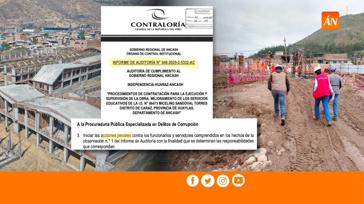 La Contraloría General de la República ha detectado graves irregularidades en el proceso de contratación para la ejecución y supervisión de la obra de mejoramiento de la Institución Educativa Micelino Sandoval Torres, ubicada en Caraz, provincia de Huaylas, Áncash. El monto total de la inversión es de S/ 46,204,467 para la ejecución y S/ 1,593,702 para la supervisión. El proyecto fue adjudicado a un consorcio ganador que habría presentado documentación inexacta para acreditar la experiencia de su plantel profesional.