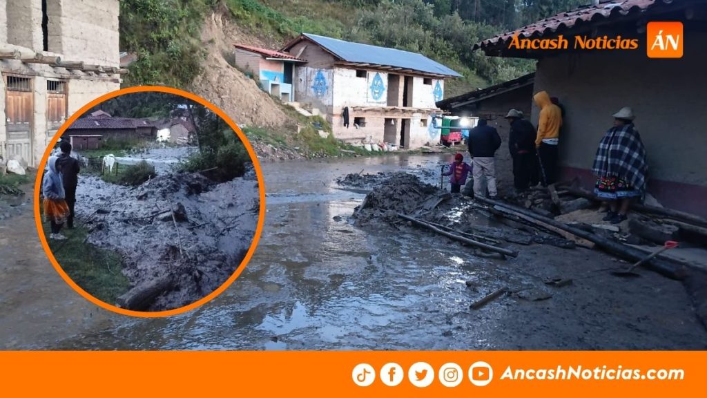 Un deslizamiento de cerro, provocado por las intensas lluvias, se registró el lunes alrededor de las 11:00 de la noche en la comunidad de Alpamayo, distrito de Pomabamba, generando un huaico que inundó varias viviendas y dejó a 11 familias afectadas.