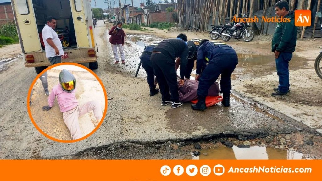 Un motociclista resultó herido tras sufrir un accidente cuando transitaba por la carretera Caraz – Huaraz, a la salida de la ciudad de Caraz, en la región Áncash. El hecho se registró pasando el arco de ingreso a la ciudad, frente al local de pescados y mariscos “El Delfín”, donde el conductor habría impactado contra un profundo forado en la pista producto del avanzado deterioro de la vía, lo que provocó su caída y le ocasionó diversas lesiones.