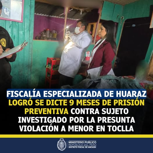 El Primer Despacho de la Fiscalía Especializada en Violencia contra la Mujer e Integrantes del Grupo Familiar de Huaraz logró que el Juzgado de Investigación Preparatoria Especializado en esta materia dicte nueve meses de prisión preventiva contra Víctor Raúl Montoro Minaya, investigado por el presunto delito de violación en agravio de una menor de 15 años en la localidad de Toclla, provincia de Huaraz.