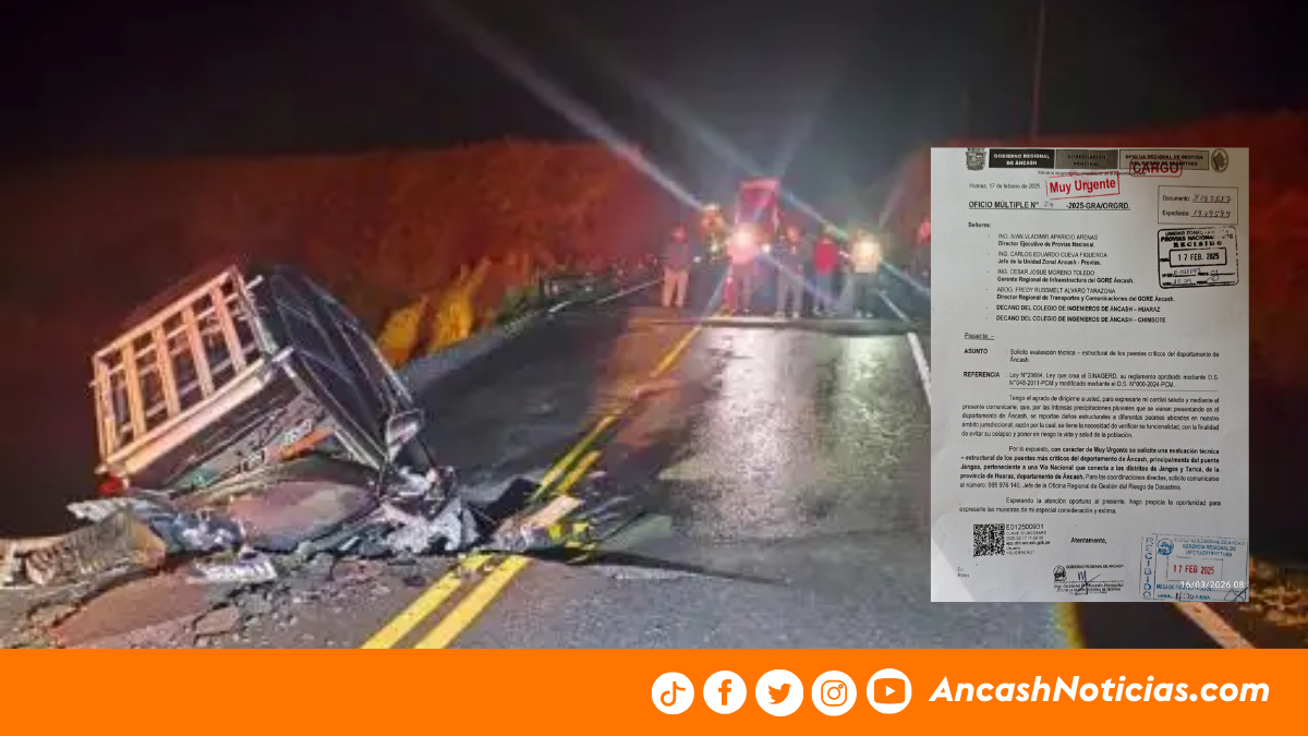 El Gobierno Regional de Áncash, a través de la Oficina Regional de Gestión del Riesgo de Desastres, reiteró el pedido a Provías Nacional, el Ministerio de Transportes y Comunicaciones (MTC) y el Colegio de Ingenieros del Perú para que realicen una verificación técnica del estado de los puentes en la región.