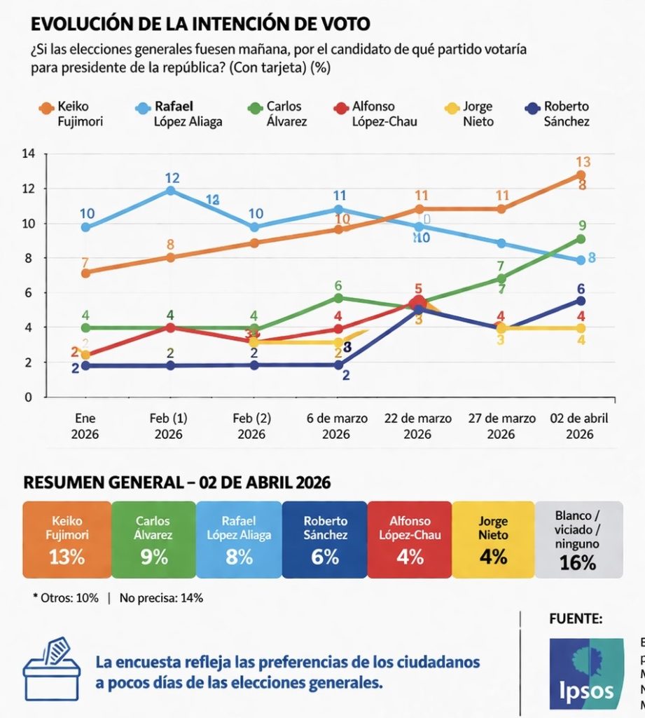 Encuesta Ipsos mueve la carrera: Fujimori lidera, Álvarez sube al segundo y López Aliaga cae al tercero mientras Sánchez se mantiene cerca