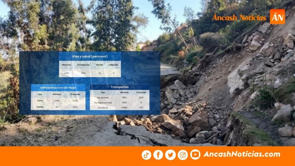 Según el último reporte del Centro de Operaciones de Emergencia Regional (COER Áncash), al 30 de abril se han registrado 869 emergencias asociadas a precipitaciones, deslizamientos, huaicos y derrumbes. Estas situaciones han dejado 4,958 personas afectadas y 1,244 damnificadas, así como daños en 2,264 viviendas, de las cuales 351 quedaron inhabitables y 131 fueron destruidas.
